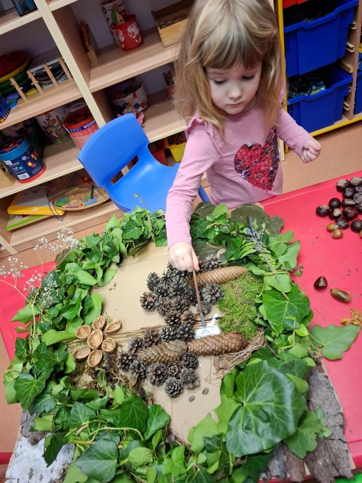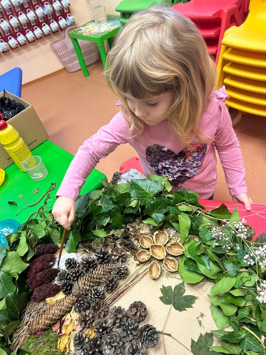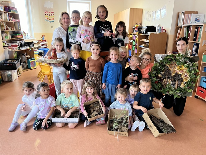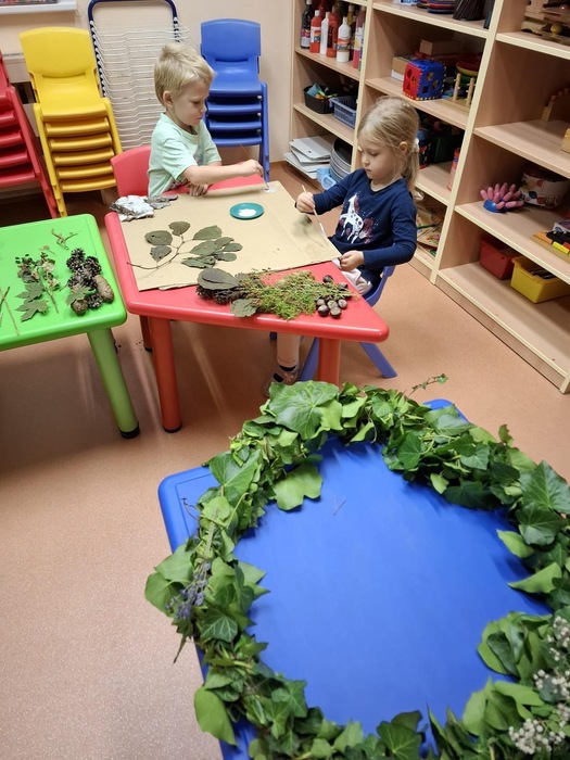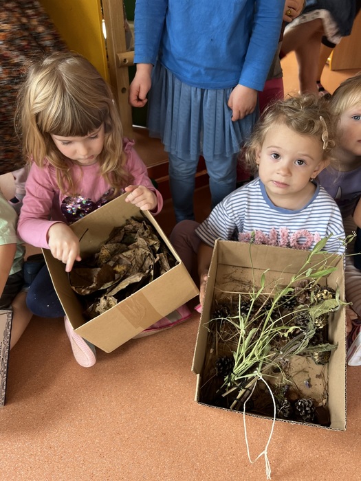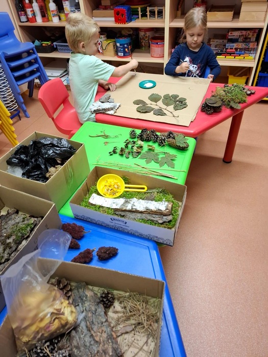 Druhá práce "Obraz z přírody" vznikala při sbírání přírodnin (listy, větvičky, květiny, šišky, mech kaštany, žaludy, šípky....) při procházkách do okolí. Děti se naučily poznávat různé přírodniny (název, barvu, kde roste, vnímat hmatem jejich strukturu). Přírodniny lisovali v knihách a sušily několik týdnů ve školce.