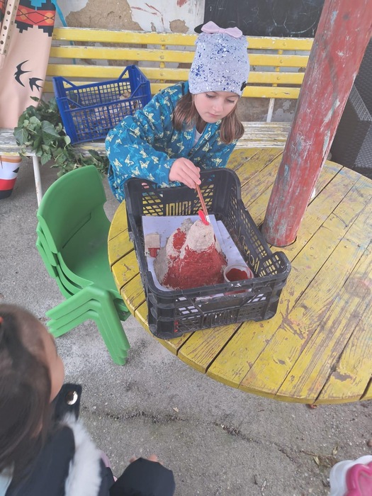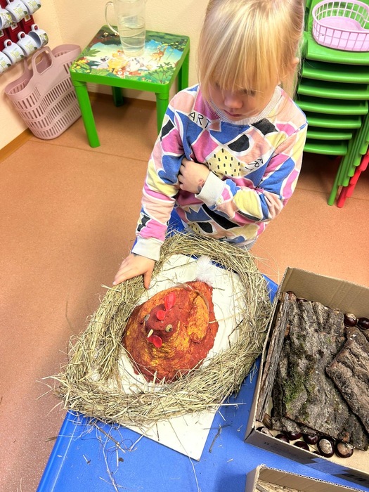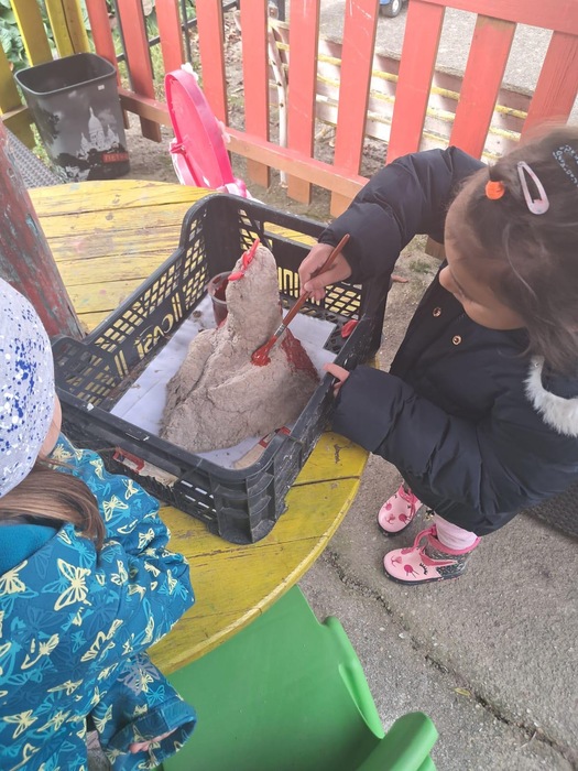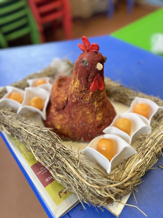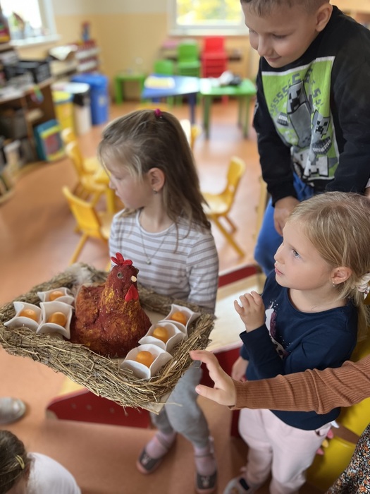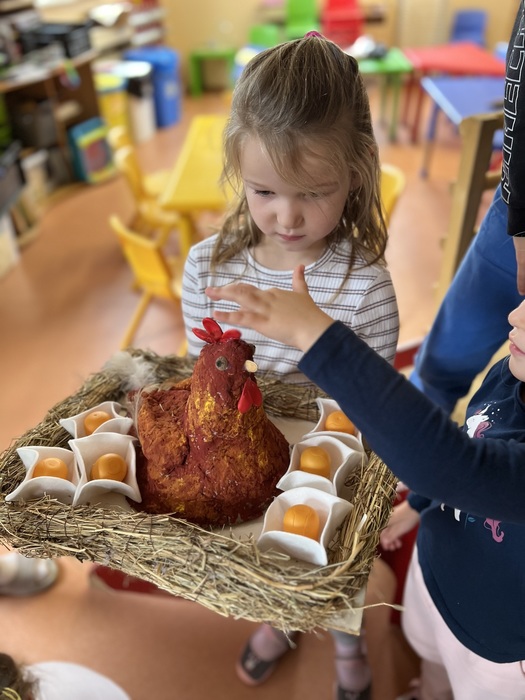 První z nich má název "Slepice" a jde vlastně o hru, kde cílem je procvičení sluchu. Děti použily ruličky od toaletního papíru, kartonové desky a plata od vajíček, které nechaly rozpustit. S pomocí lepidla vytvořily hmotu a vytvarovaly slepičku, kterou po zaschnutí namalovaly a nazdobily. Pro slepičku vytvořily ze sena hnízdo a plnily vajíčka.