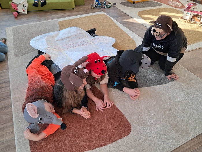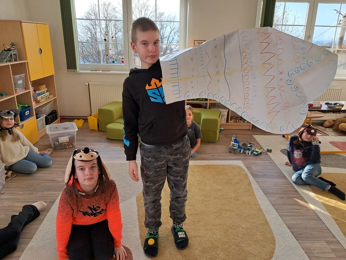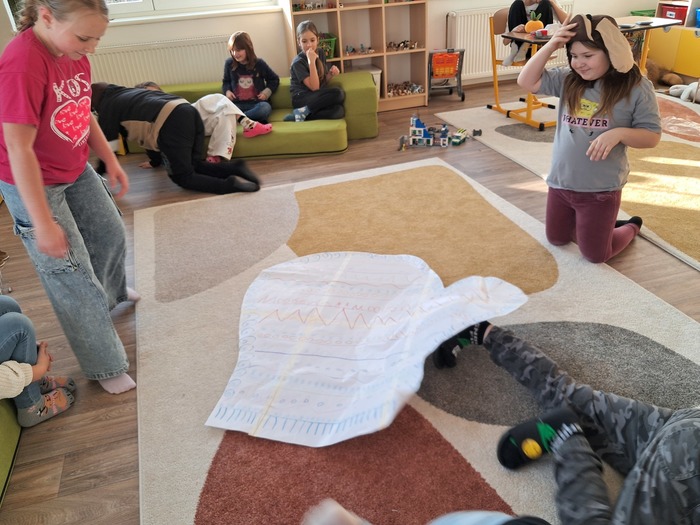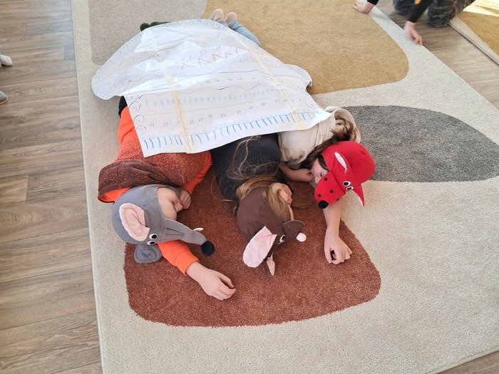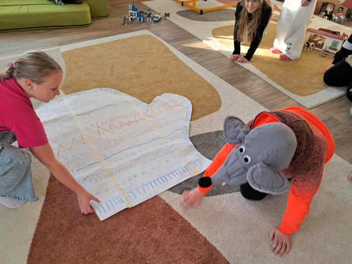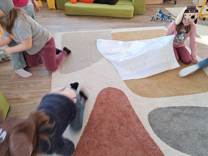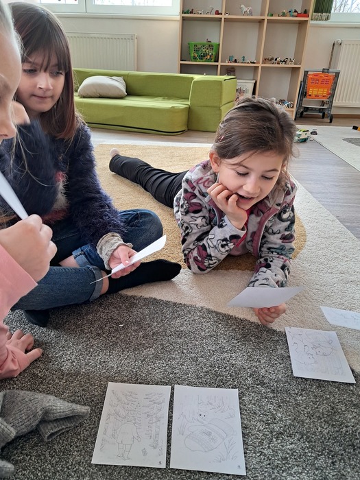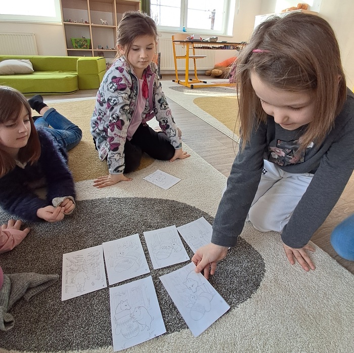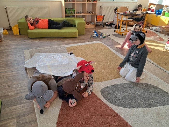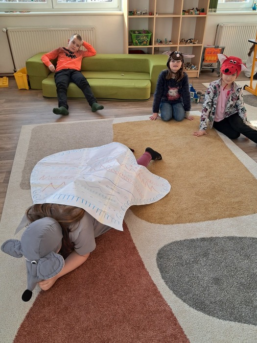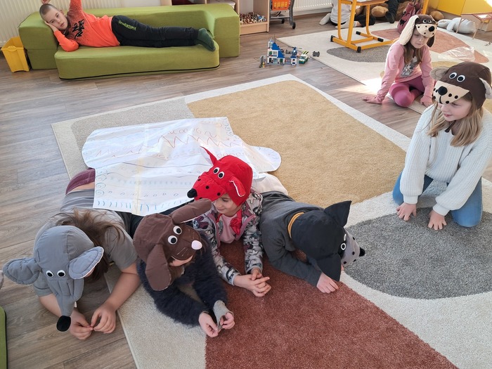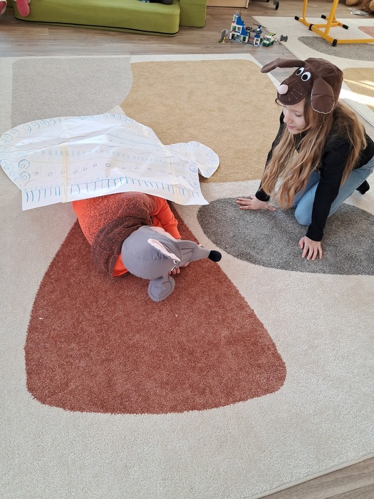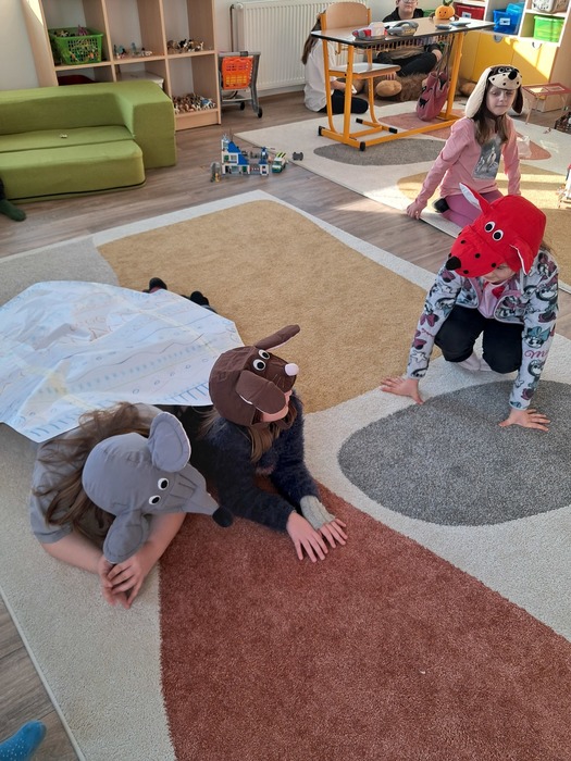 Společně jsme si přečetli příběh. Děti si vylosovaly obrázek k pohádce a společně pak poskládaly příběh podle posloupnosti. Největší úspěch měla samotná dramatizace, do které se postupně zapojili všichni.