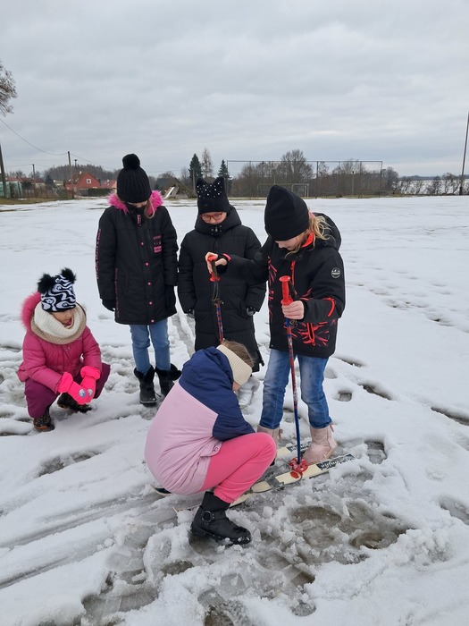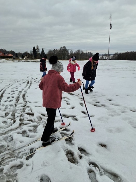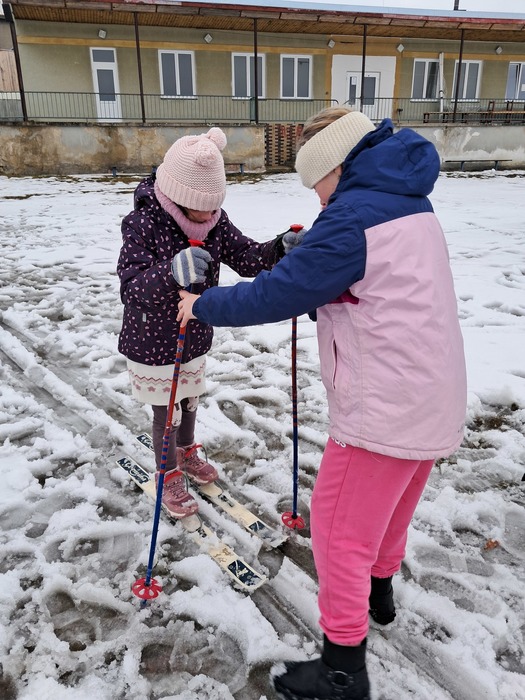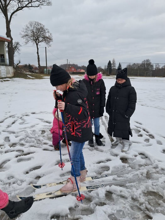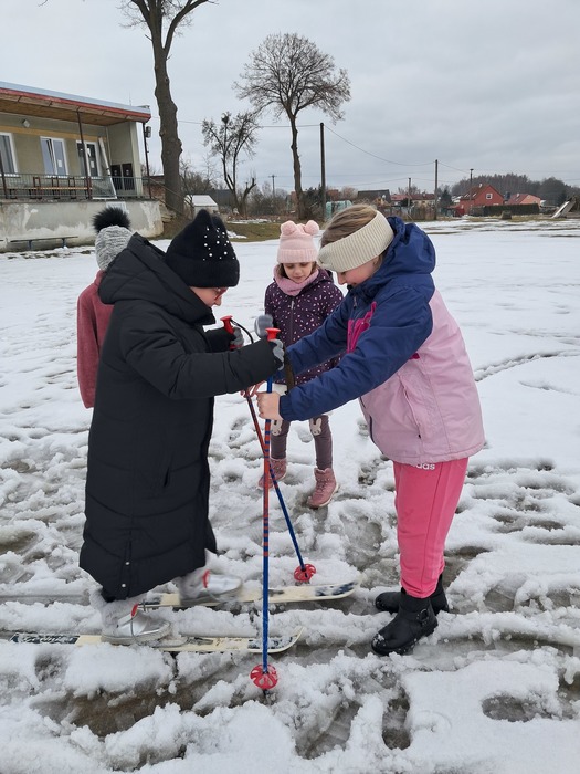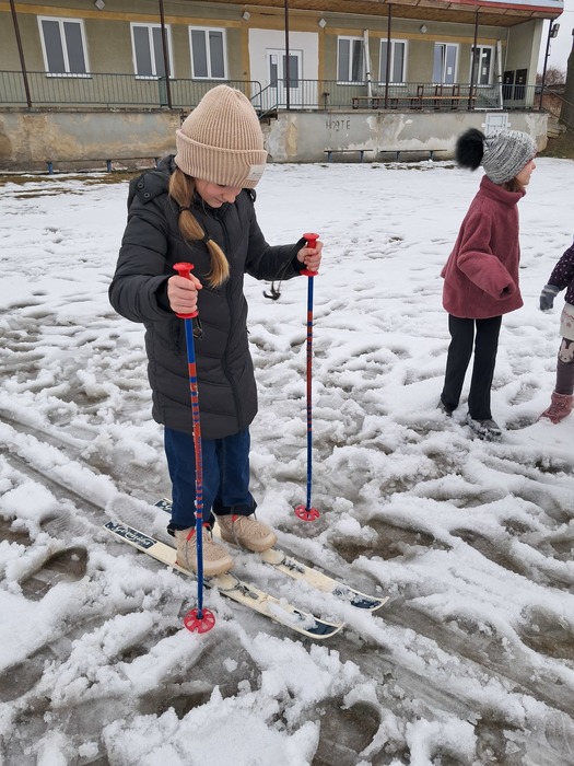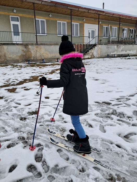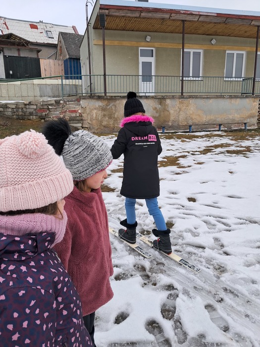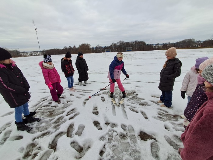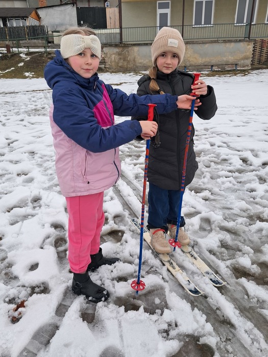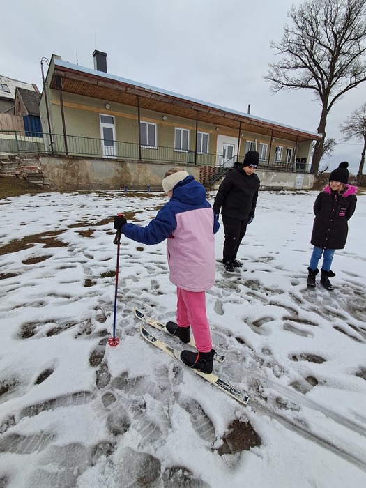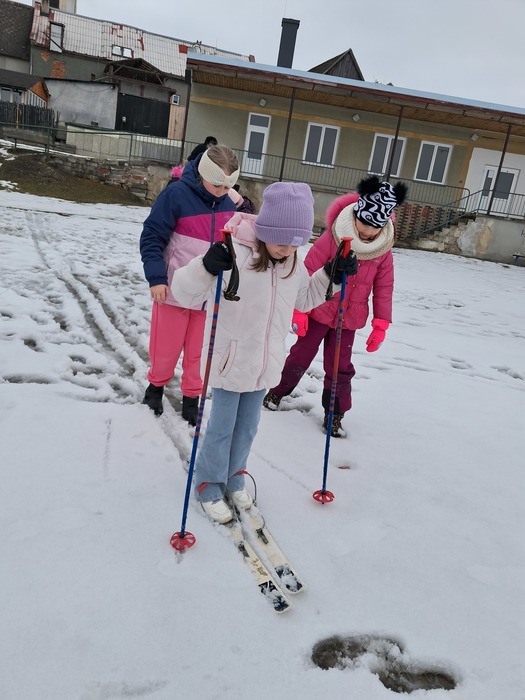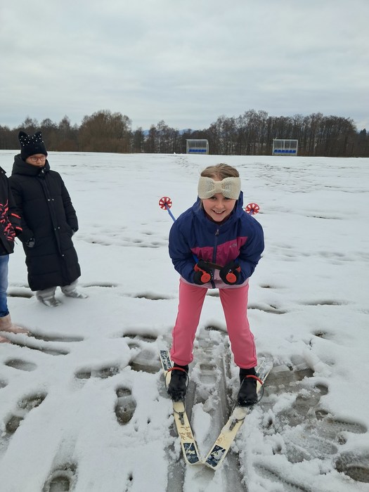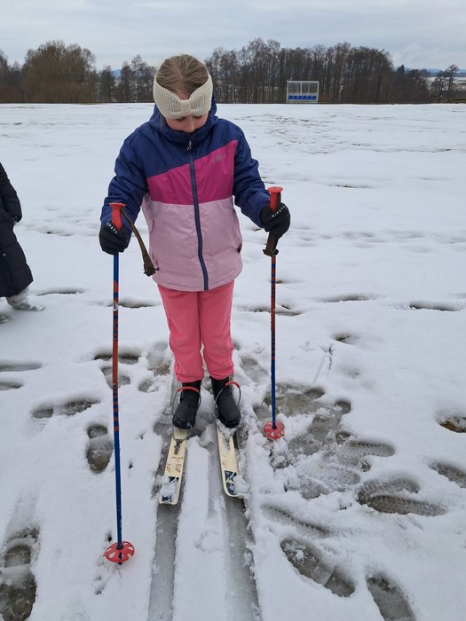 Málo sněhu a staré lyže? Nevadí. Máme skvělou instruktorku a alespoň jsme si to zkusili.
