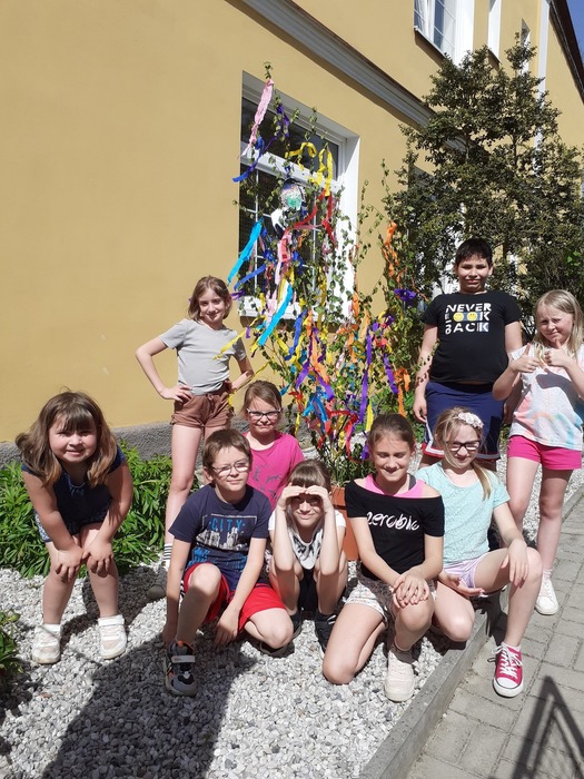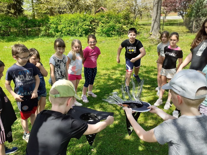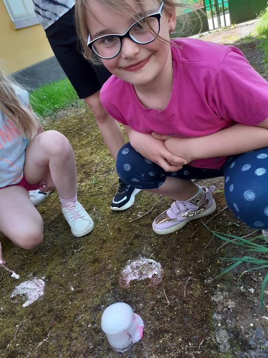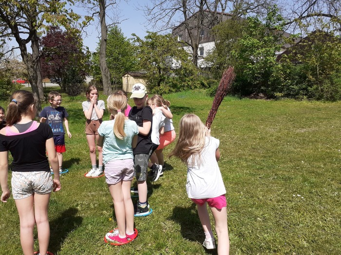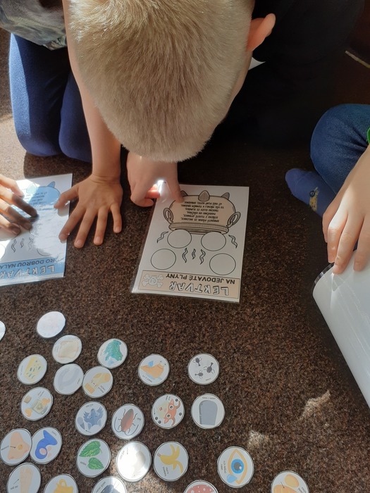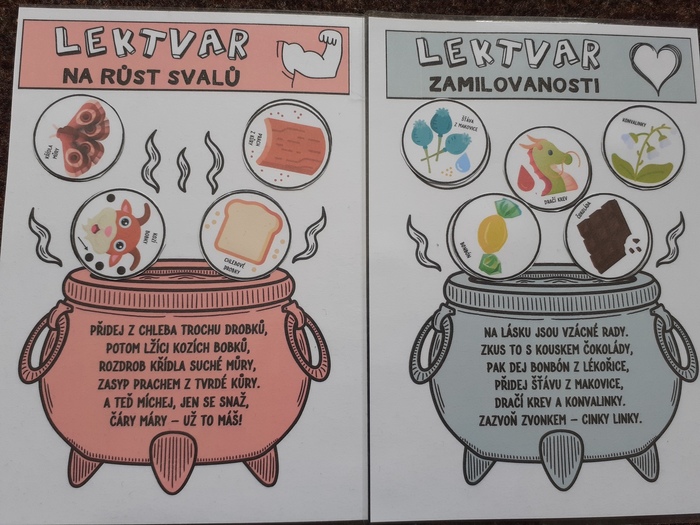 Lektvary: čteme veršované recepty a přiřazujeme správné ingredience; procvičujeme paměť - vytáhni si lístek, zapamatuj si ingredience a přidej je do kotlíku; provádíme pokus s bublajícím lektvarem. Na zahradě si také děti zahrály honěnou s koštětem, chytaly pavouky do klobouků a házely čarodějnicemi, které si vytvořily. Poslední dubnové odpoledne si pak ozdobily svojí májku.