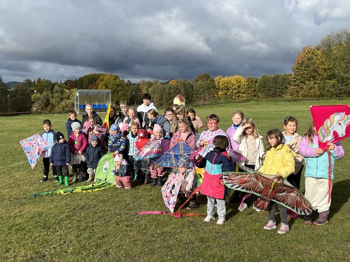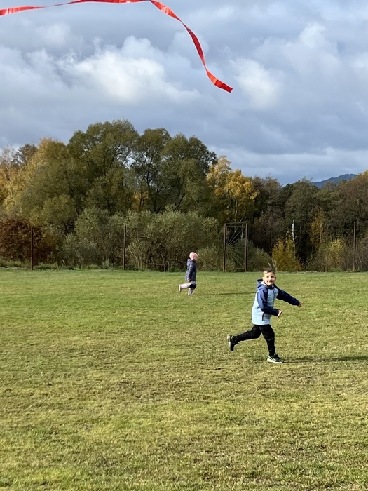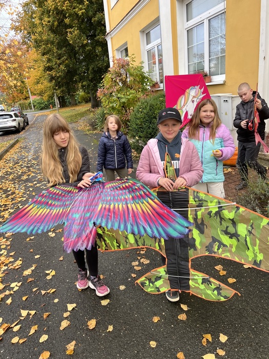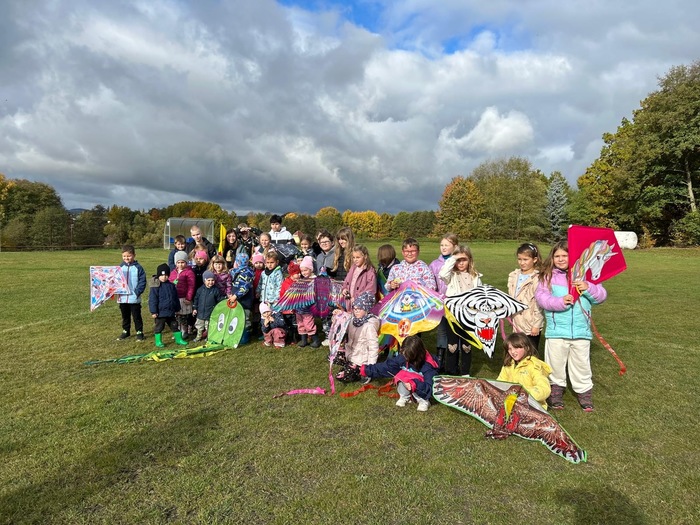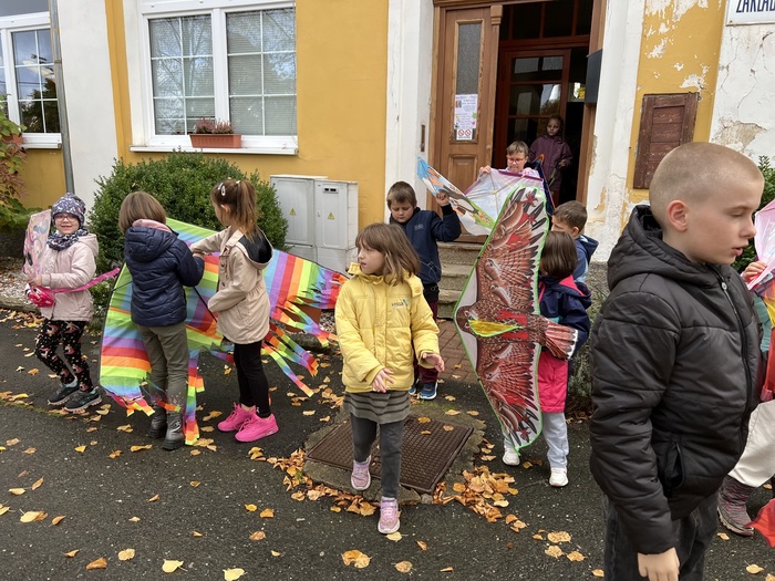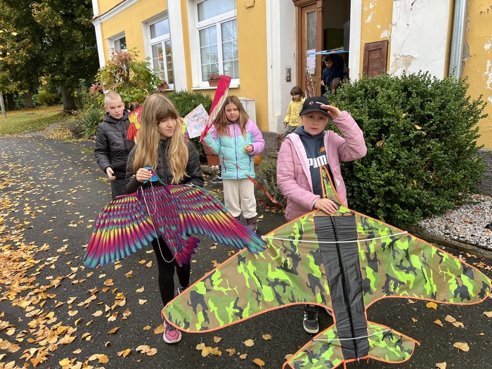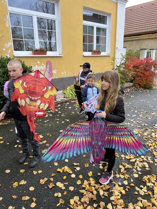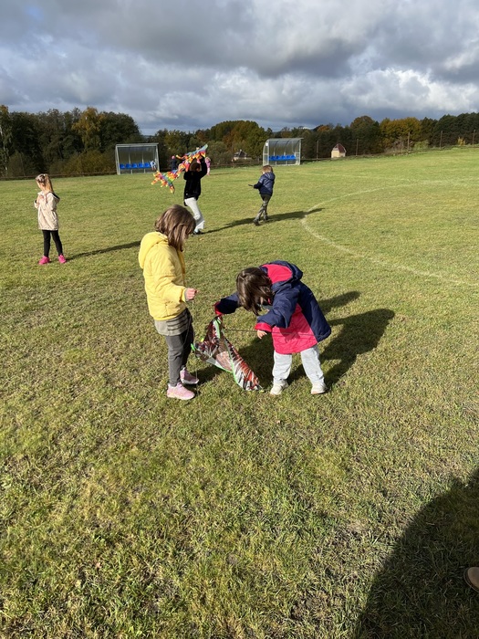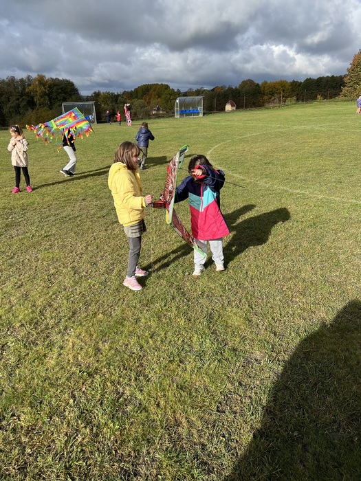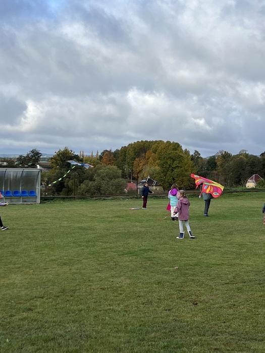 Závěrečnou aktivitou projektového dne bylo společné pouštění draků na fotbalovém hřišti. Žáci naší školy spolu s dětmi z MŠ běhali po hřišti a sledovali, jak barevní draci stoupají do vzduchu.