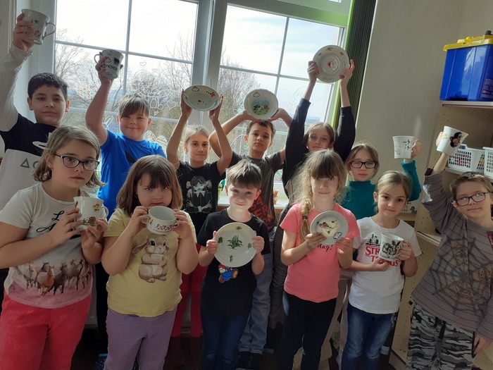 Dne 13.3. měly děti zážitkový den v porcelánce. Prošly si výrobní haly, seznámily se s výrobou a nakonec si každý vyrobil svůj hrnek nebo talířek. Ve škole pak děti tvořily hrnky a talíře z papíru v rámci pracovních činností. Velikou radost měly o dva týdny později, když si hrdě odnášely své výrobky.