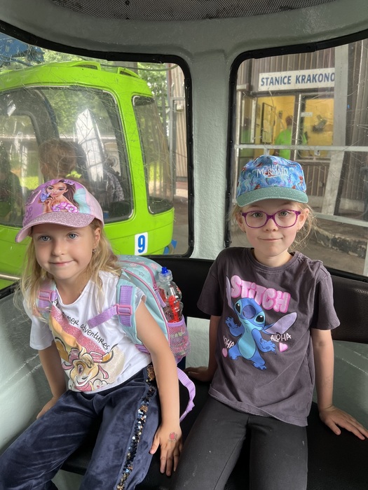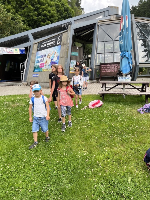 Společně jsme se vydali na jízdu lanovkou, která byla pro mnohé děti opravdovým zážitkem. Nahoře nás čekala procházka mezi pohádkovými sochami a obdivovali jsme i sochu Krakonoše, která zaujala malé i velké.